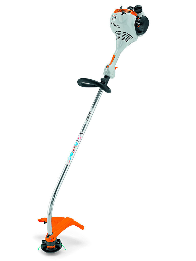 Stihl FS 55 – удобный легкий бензиновый триммер с серебристым корпусом общим весом всего 5 килограммов.